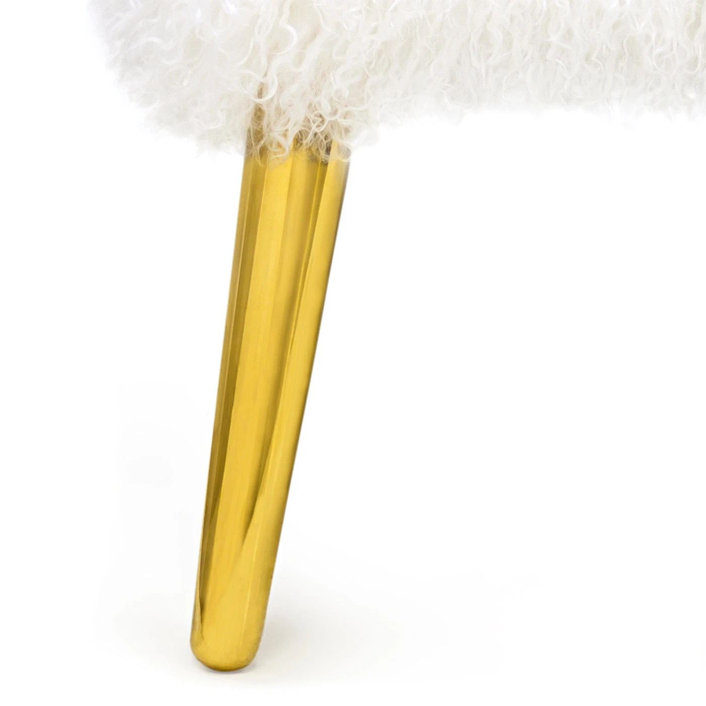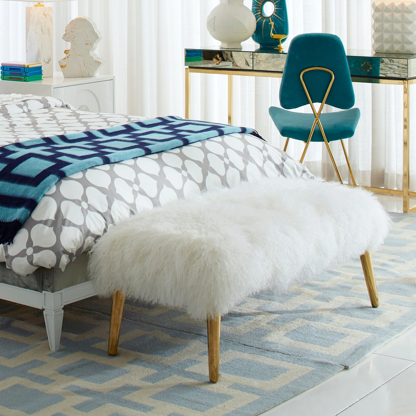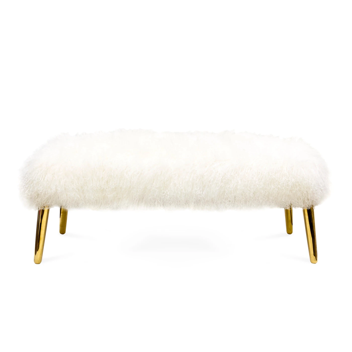 A plush Mongolian lamb bench with brass legs for a surprising and glamorous twist. It’s the perfect perch at the foot of a bed, a natural opposite a sofa, and fab in an entryway.