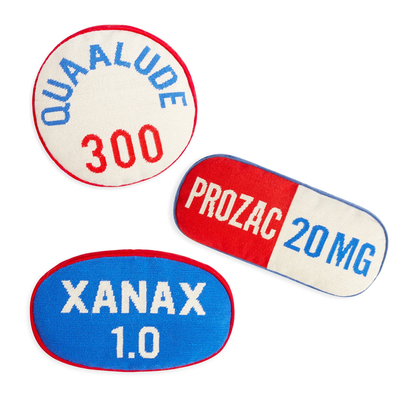 Our Prescription Pillow Set includes our Quaalude, Prozac and Xanax needlepoint pillows.