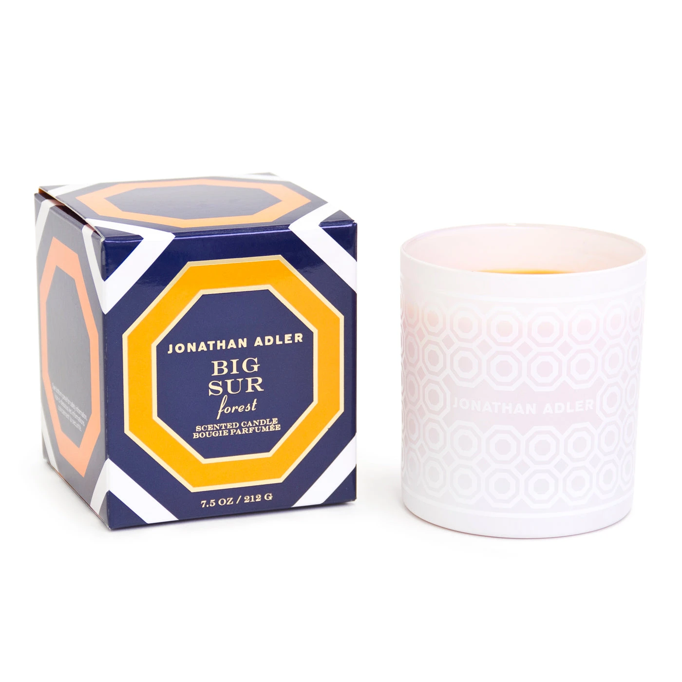 This candle comes in a white glass vessel etched with our signature octagon-print and a très chic box.