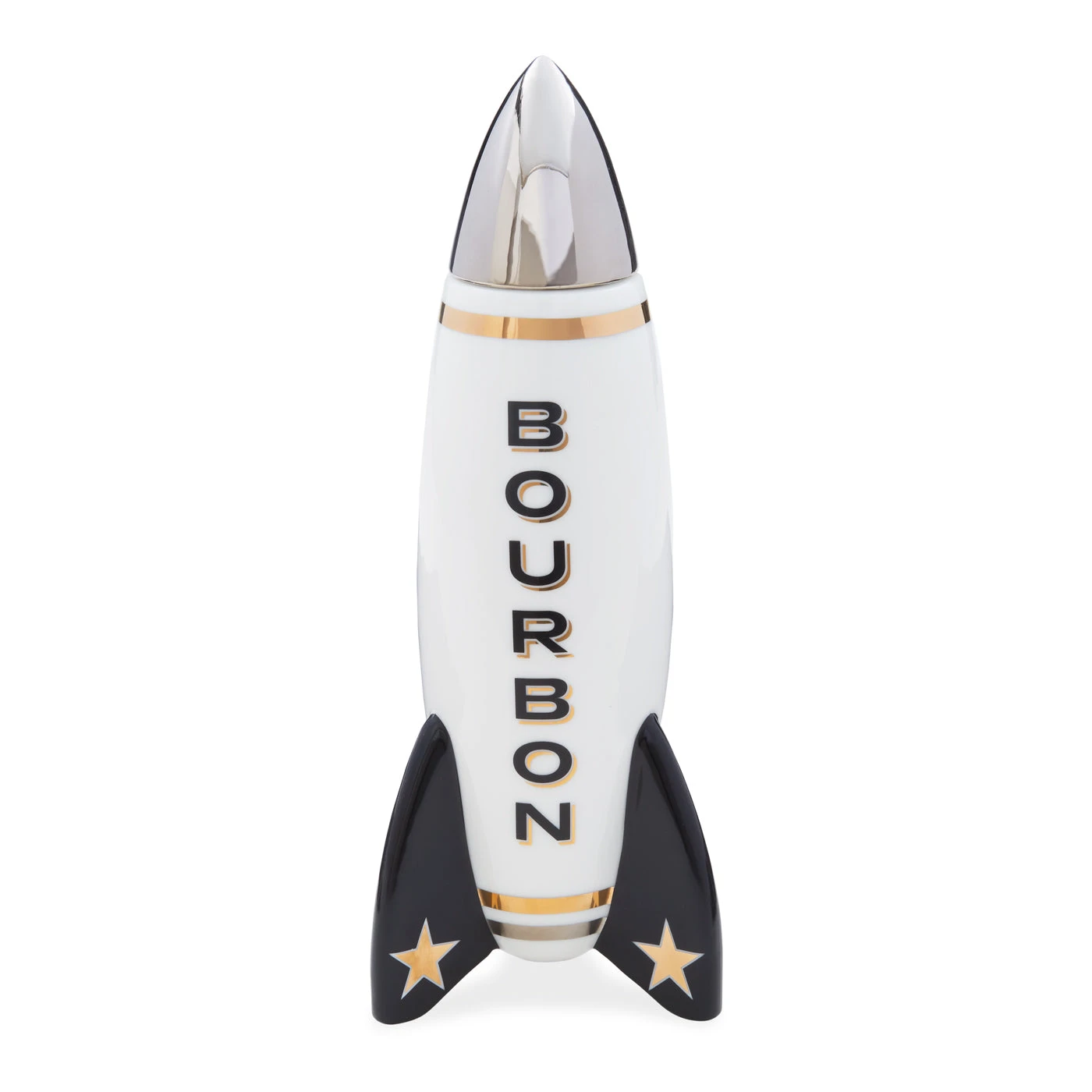 Send spirits into orbit with our retro-rad black and 16-karat gold luster porcelain decanters. Embellished with bold suggestions of what to stash in each—even bottom shelf booze becomes out-of-this-world. Equipped with hard-working gaskets for optimal spirit storage. A stylish sophisticate deserves a fully styled bar to match. Corral with our Gin, Vodka, Whiskey, and Rum Rocket Decanters and have a blast.