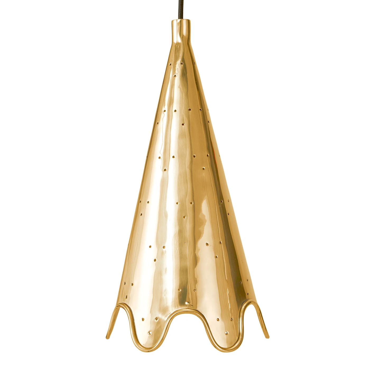 Timelessly simple and unimpeachably luxe, our Ripple Pendant features a brass cone finished in our signature ruffled edge. An all over pattern of perforation emits dots of light, while its luminous metallic finish naturally boosts your bulb’s glow—doubly decadent. Line them above a luxe kitchen island, or suspend one above your bedside table for moody glamour in the boudoir.