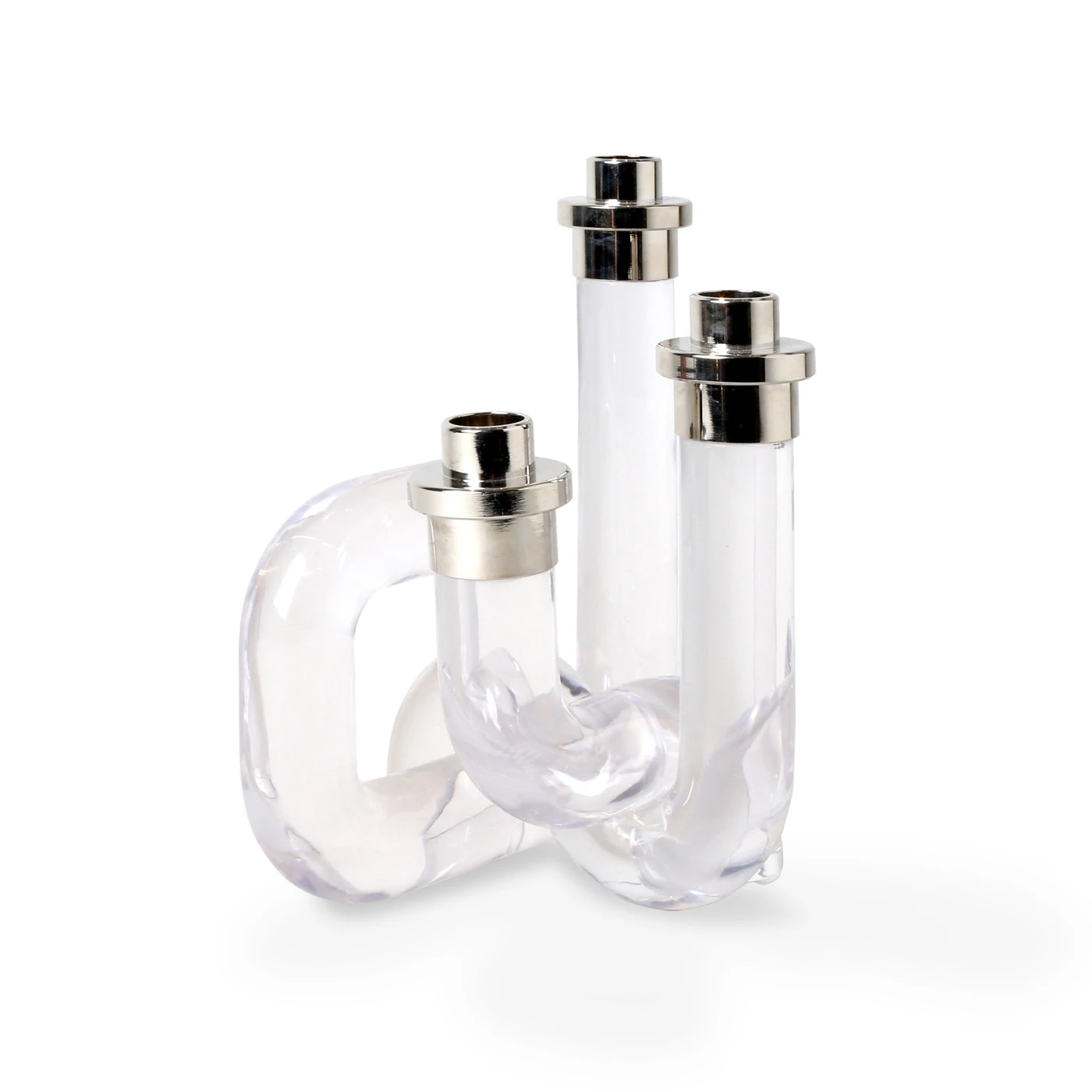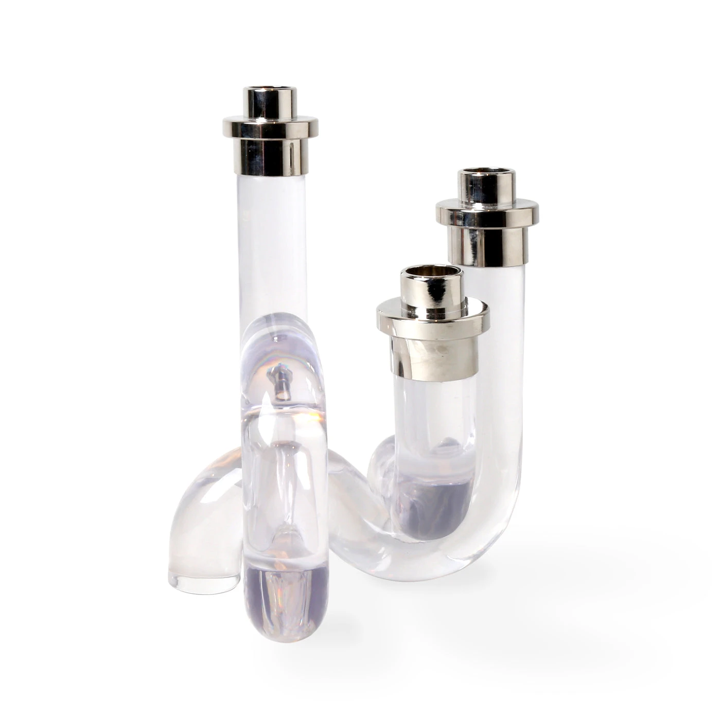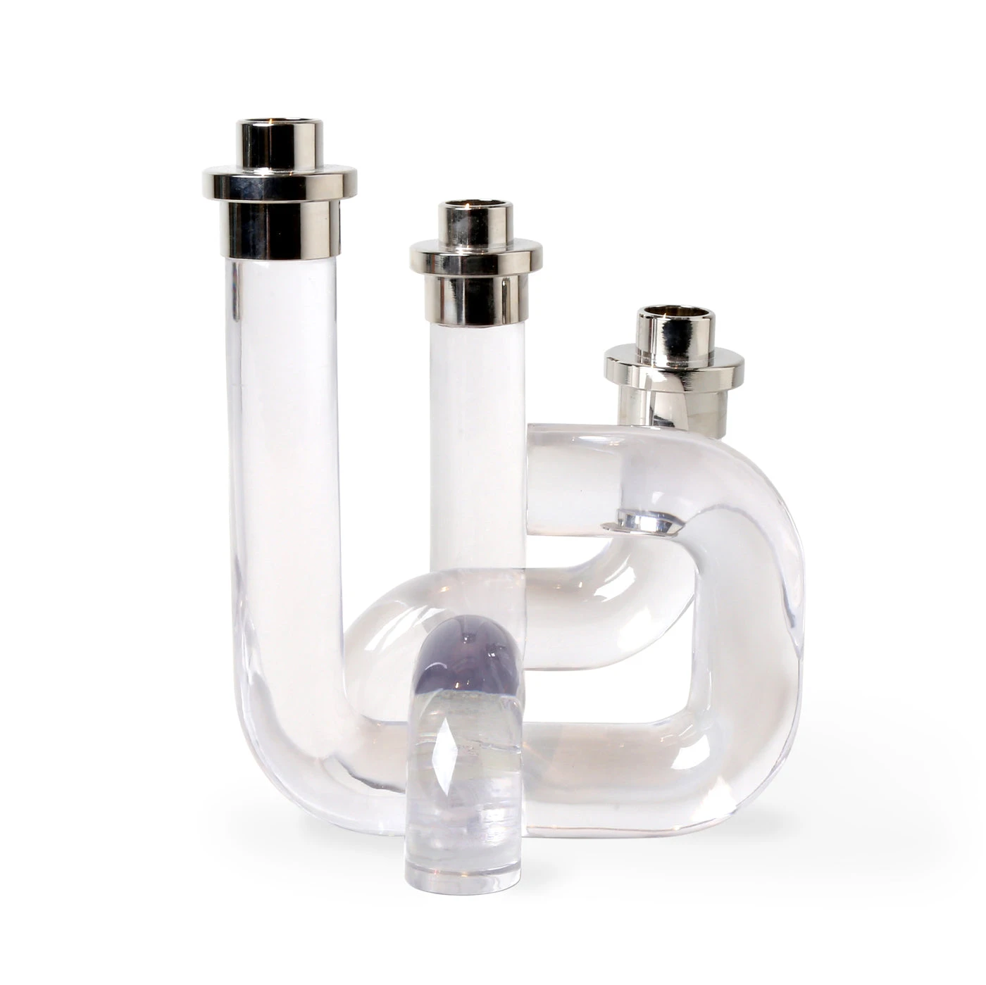 Our Pompidou Candleholders pair 70s-inspired patterns with daring dimension for added ooomph. Featuring solid acrylic pipes fused together and accented with polished nickel. Available in a chic clear or a bold primary colorway for a modern glow to match any mood.