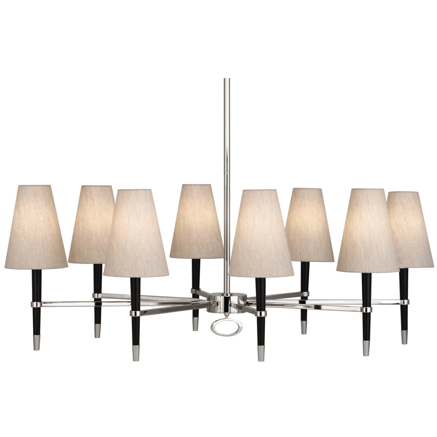 An elevated classic made from ebonized wood with antiqued brass or polished nickel accents. Our Ventana Oval Chandelier hangs handsomely with a touch of twinkle, topped with natural linen shades.