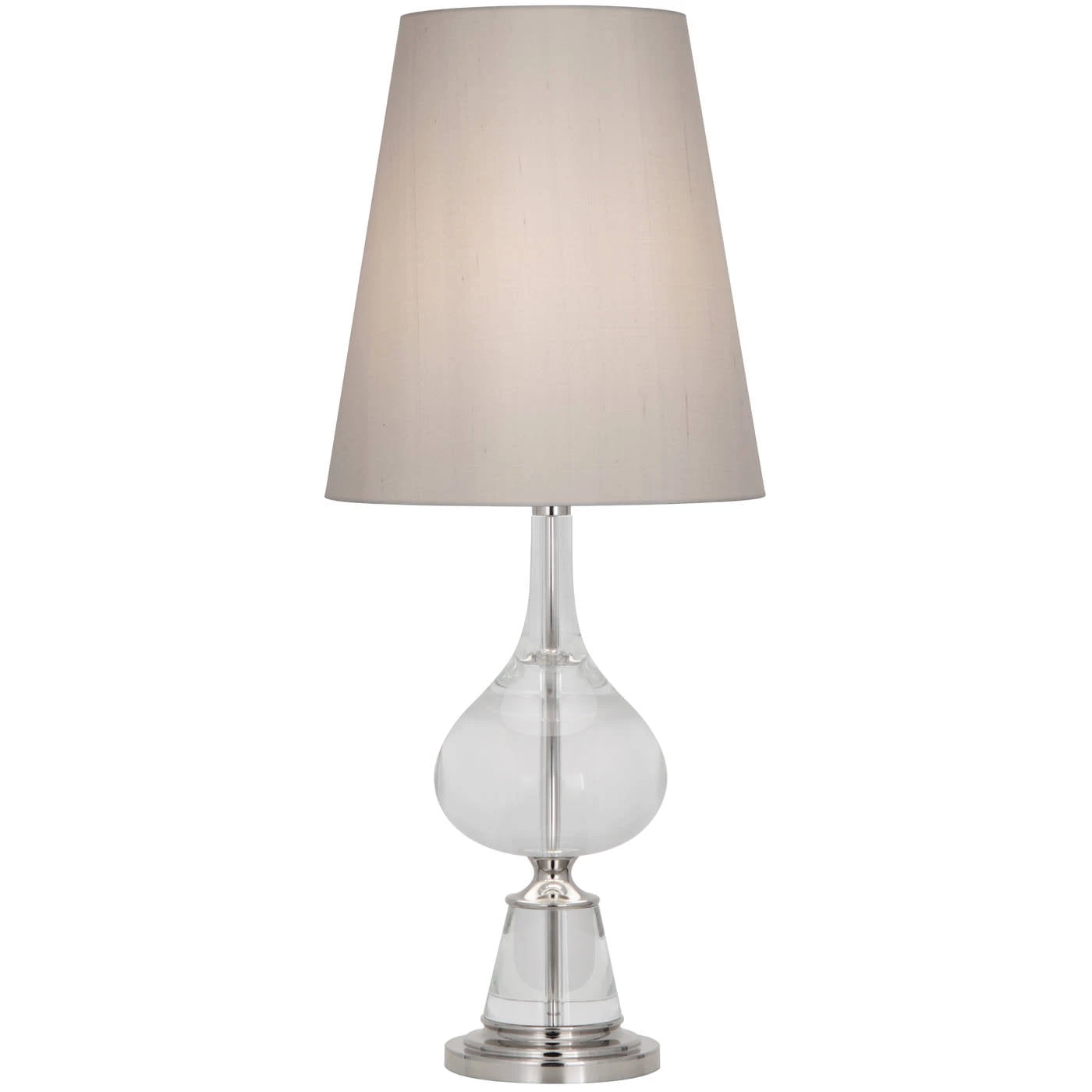 The Claridge Collection: lead crystal with polished nickel accents and oyster or black silk dupioni shades.