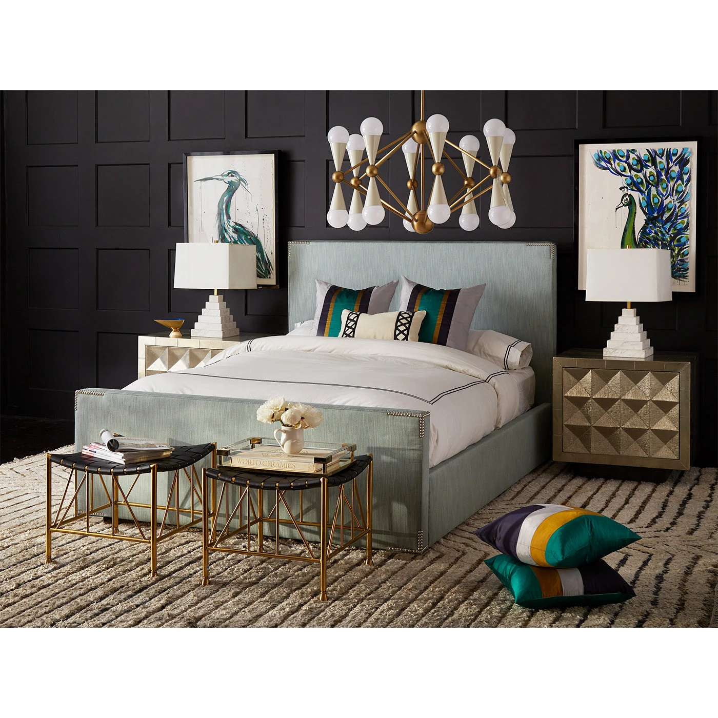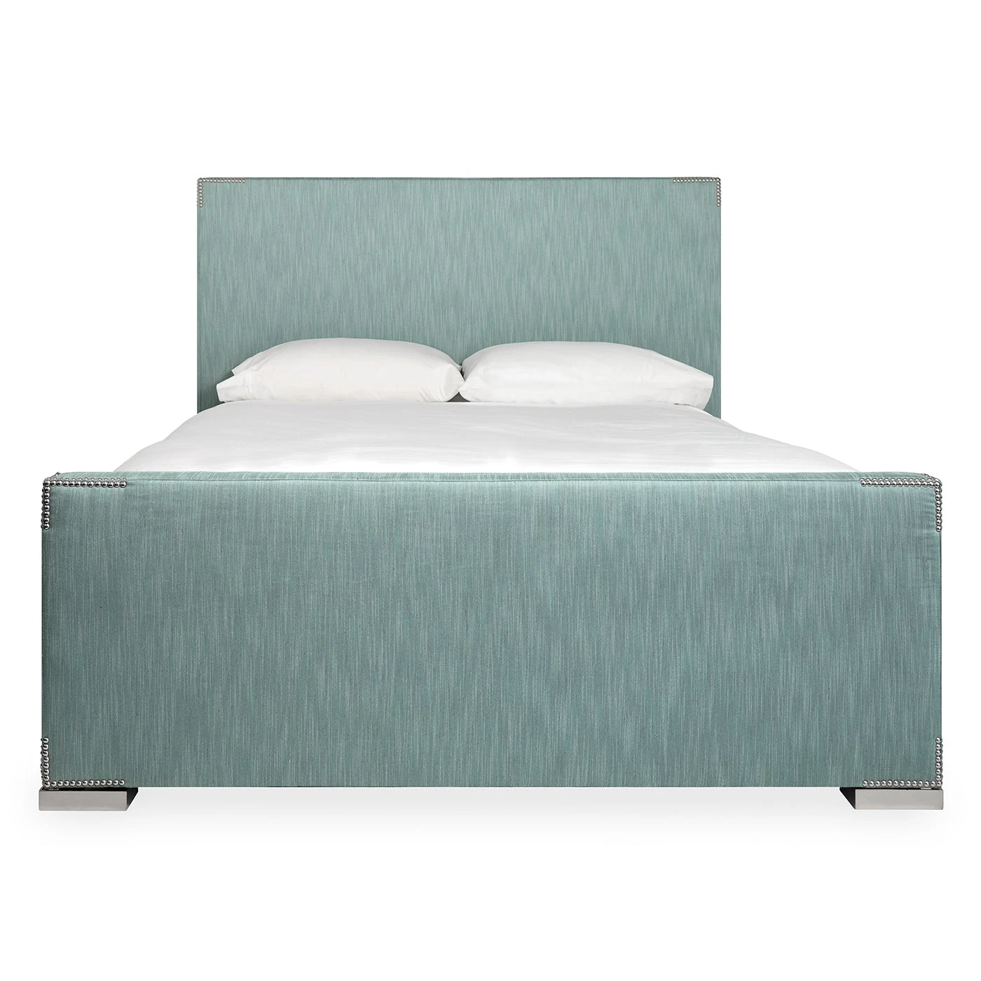 Perfectly minimalist and modern—with a subtle layer of glamour. We’ve arranged nailheads in a pattern to simulate campaign corners, adding subtle ornamentation to a simple upholstered silhouette. The regal frame rests on chunky solid brass feet, cultivating a stately presence. Finally, a bed husbands and wives will agree on.