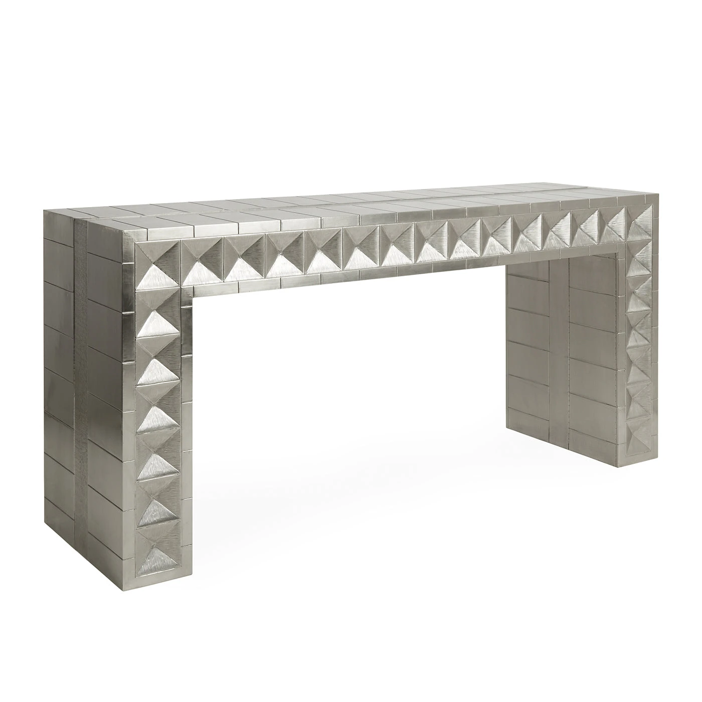 Our Talitha collection is crafted from nickel-plated metal with hand-stamped patterns applied to minimalist, modernist forms. Our waterfall console’s surface is reminiscent of silver leaf—it emits that same lustrous glow—but is wonderfully durable. Perfect for adding a regal, rich hippie vibe to your Park Avenue penthouse entryway or a bit of twinkly glamour behind a sofa in your downtown loft.