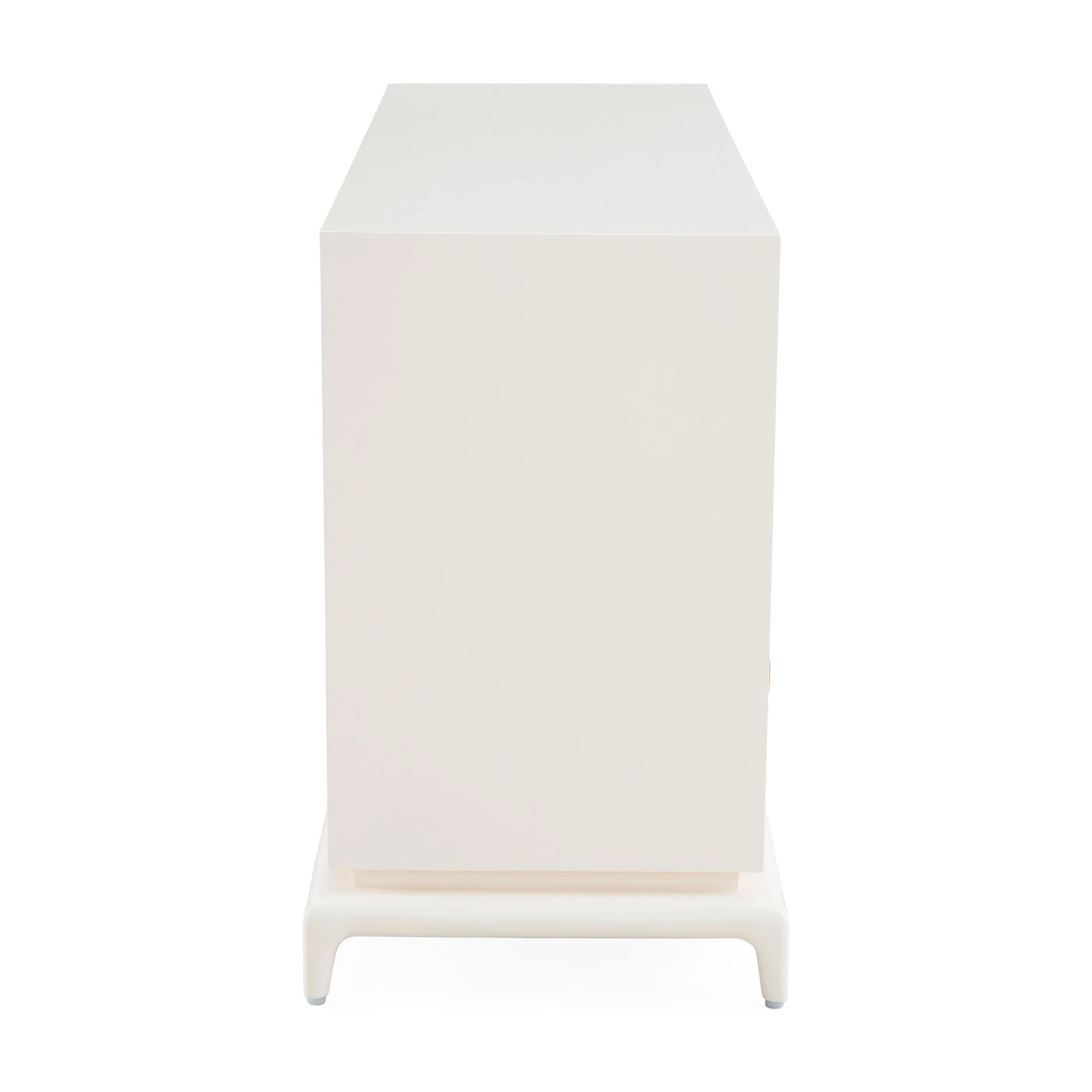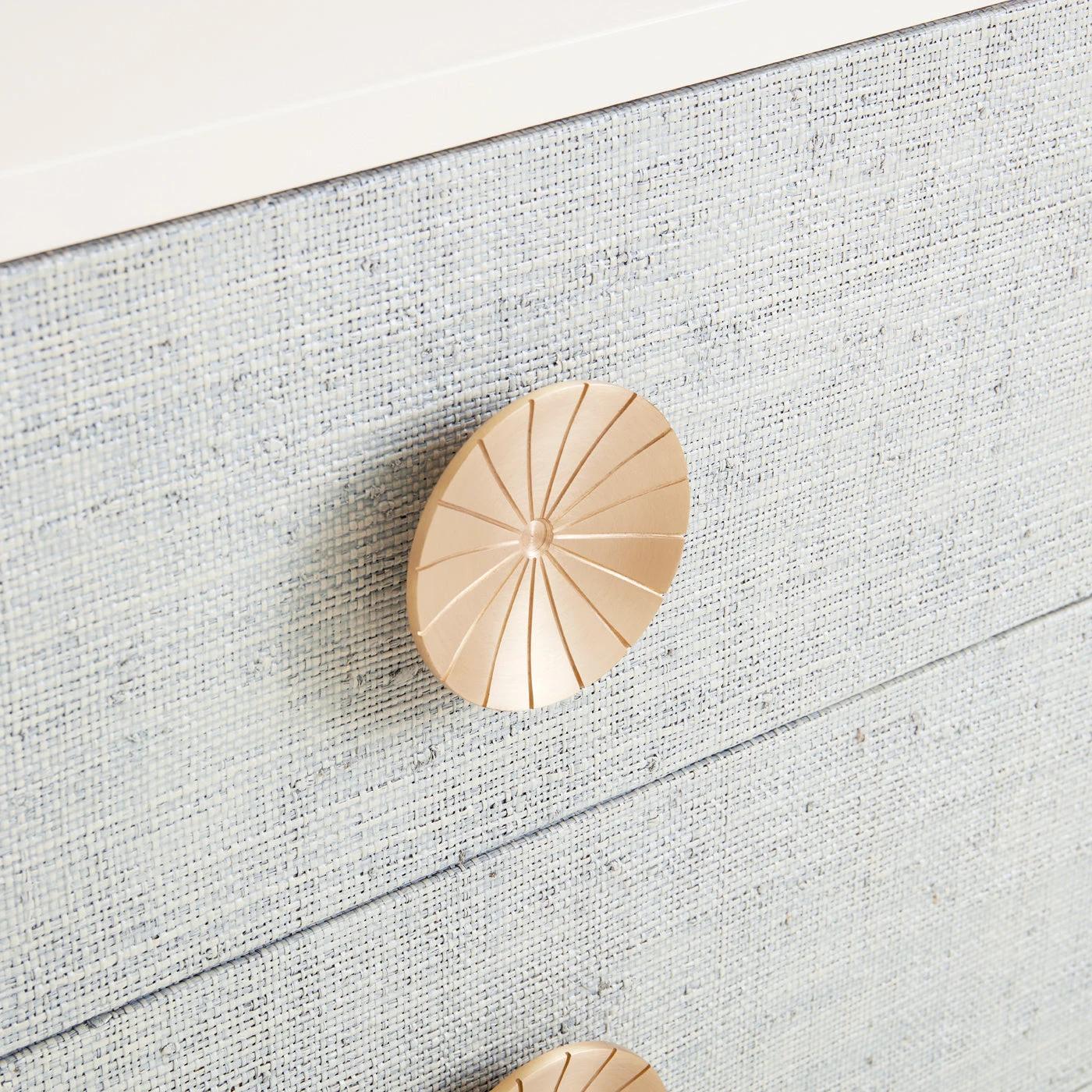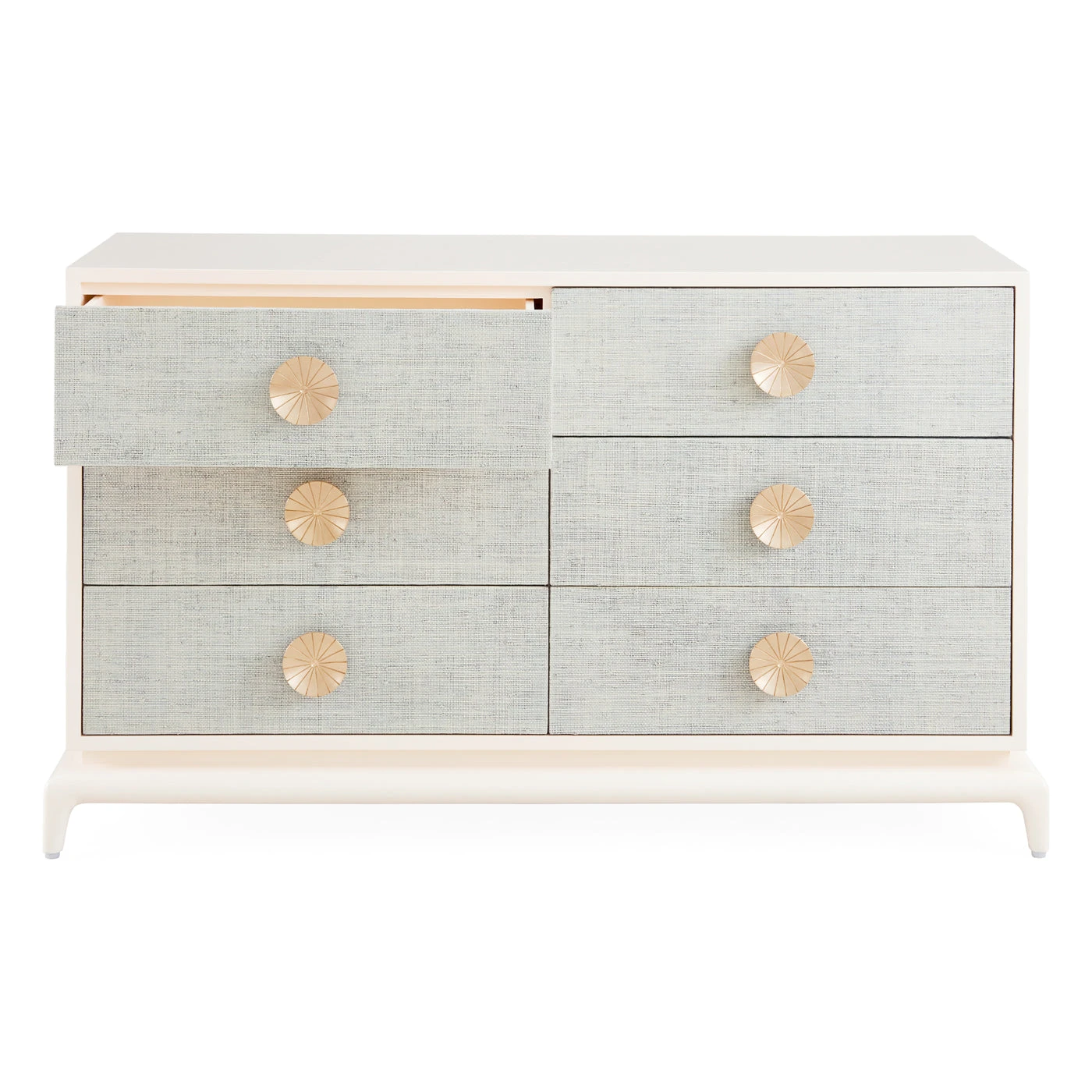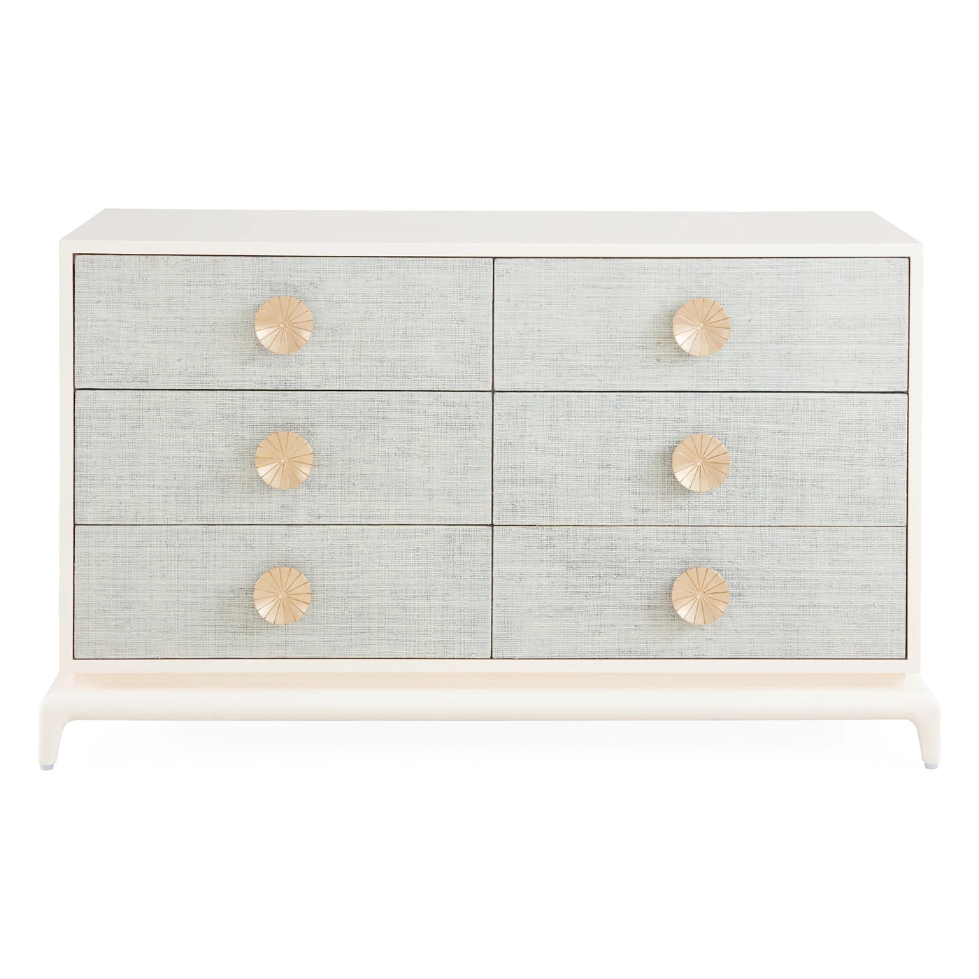 A solid mahogany case coated in ivory lacquer and faced with layers of natural raffia stained in an icy sky blue lacquer. Featuring deep, self-close drawers with oversized solid brass pulls etched with a grooved radial pattern.