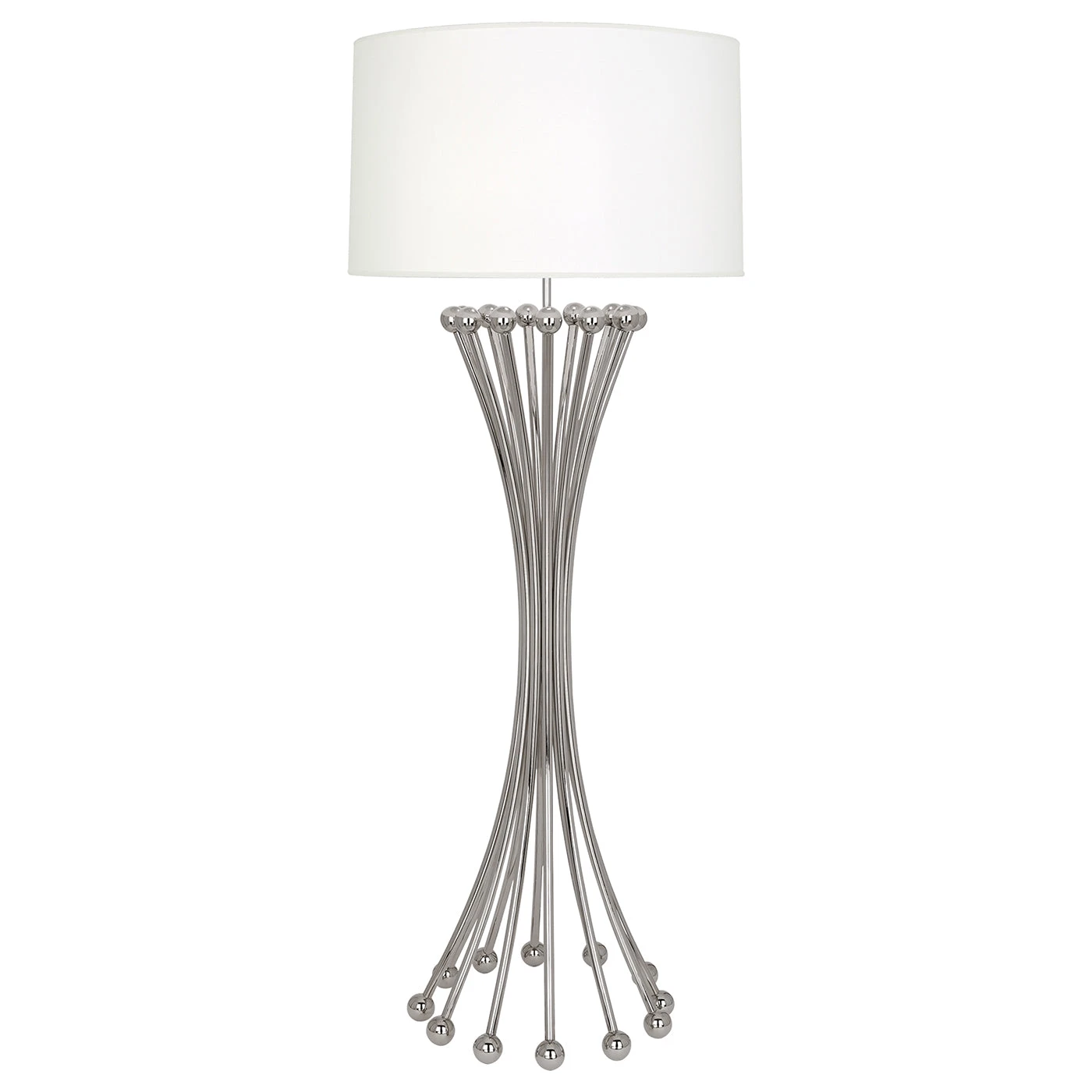 Inspired by Atomic Era mid-century lighting and treated to fabulous French flair, our Biarritz Floor Lamp features a clutch of ball-capped metal rods shaped to form an hourglass silhouette. Choose polished brass or shiny nickel for a towering twinkle, or satin black with brass accents for an industrial touch.