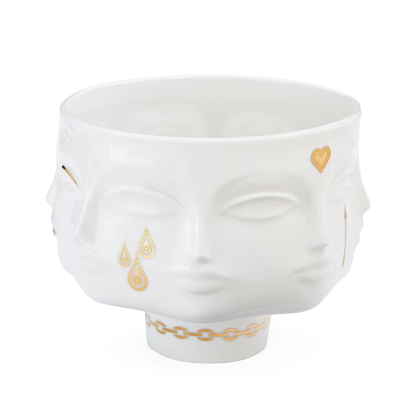 We’ve given our iconic Muse collection a face lift. Actually, more like a de-face lift. Subversive signs and symbols rendered in glittering gold adorn the glossy high fired porcelain pieces—signature favorites with the glamour cranked up to 11.