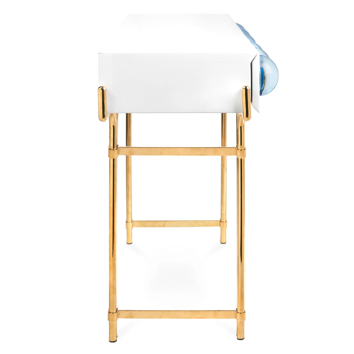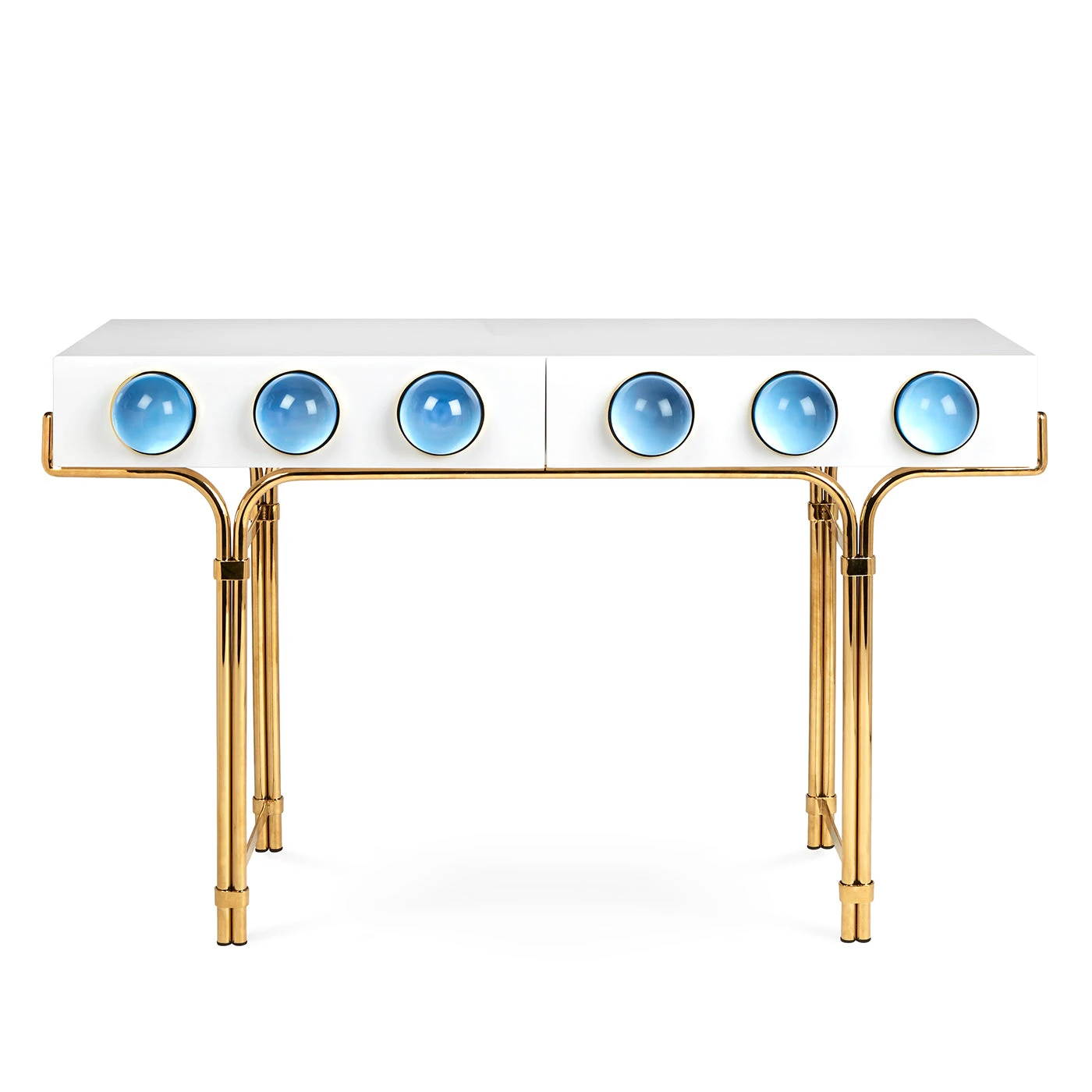 Float into our world of dreamy orbs and cabochons. Our Globo Console features a glossy white lacquer cabinet cradled by a sinuous brass framework and dotted with luminous solid blue acrylic cabochons set in polished brass. Sized to slip into smaller spaces, but also the kind of high-voltage glamour that stands out in a larger room.