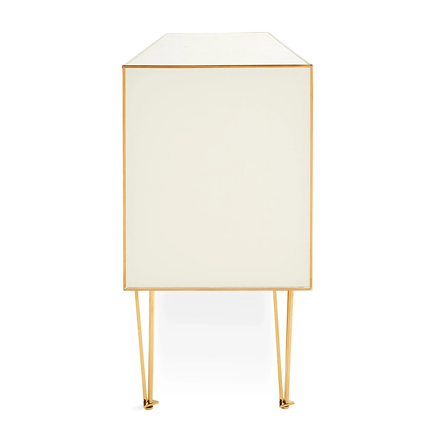 A little Italian Modern, a lot of irresistible color. Our Harlequin Credenza features back painted glass panes in angular forms in muted, sunrise-inspired hues or bold and brilliant blues. The ivory case is tipped with brass edging, adorned with super-modern grooved hardware, and perched on our futuristic interpretation of a hairpin leg.