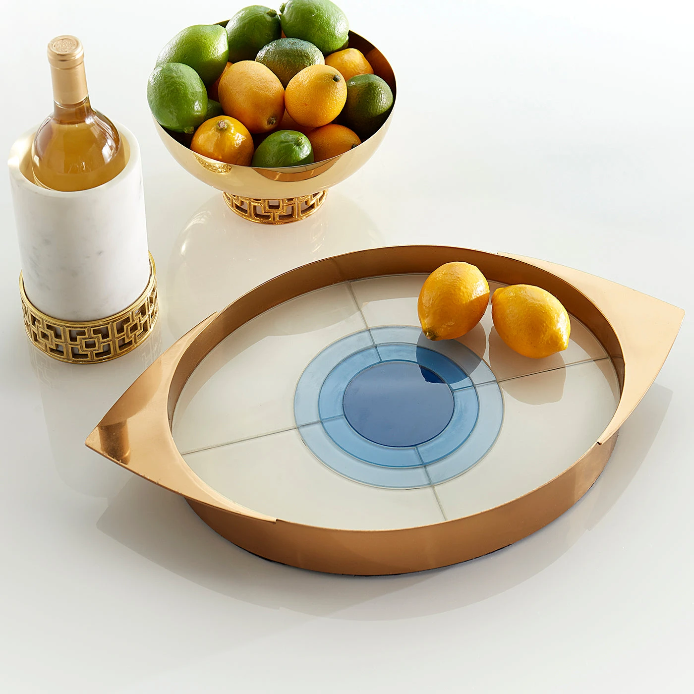 An eye-conic expression of Modern American Glamour, our Harlequin Eye Tray pairs our signature wink of chic with a brilliant blue colorway. Featuring back painted glass set in a polished brass frame, it’s a covetable way to corral your prized possessions and an eye-catching addition to afternoon tea.