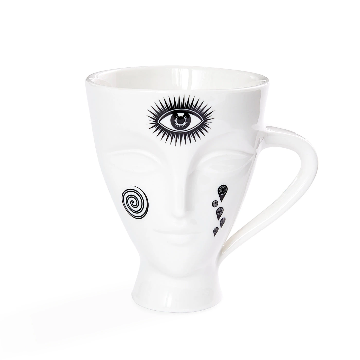 We gave our favorite ethereal looker a de-face lift. Featuring Giuliette’s glossy finish porcelain gaze on both front and back, each side is provocatively punctuated with unique, inky black iconography.