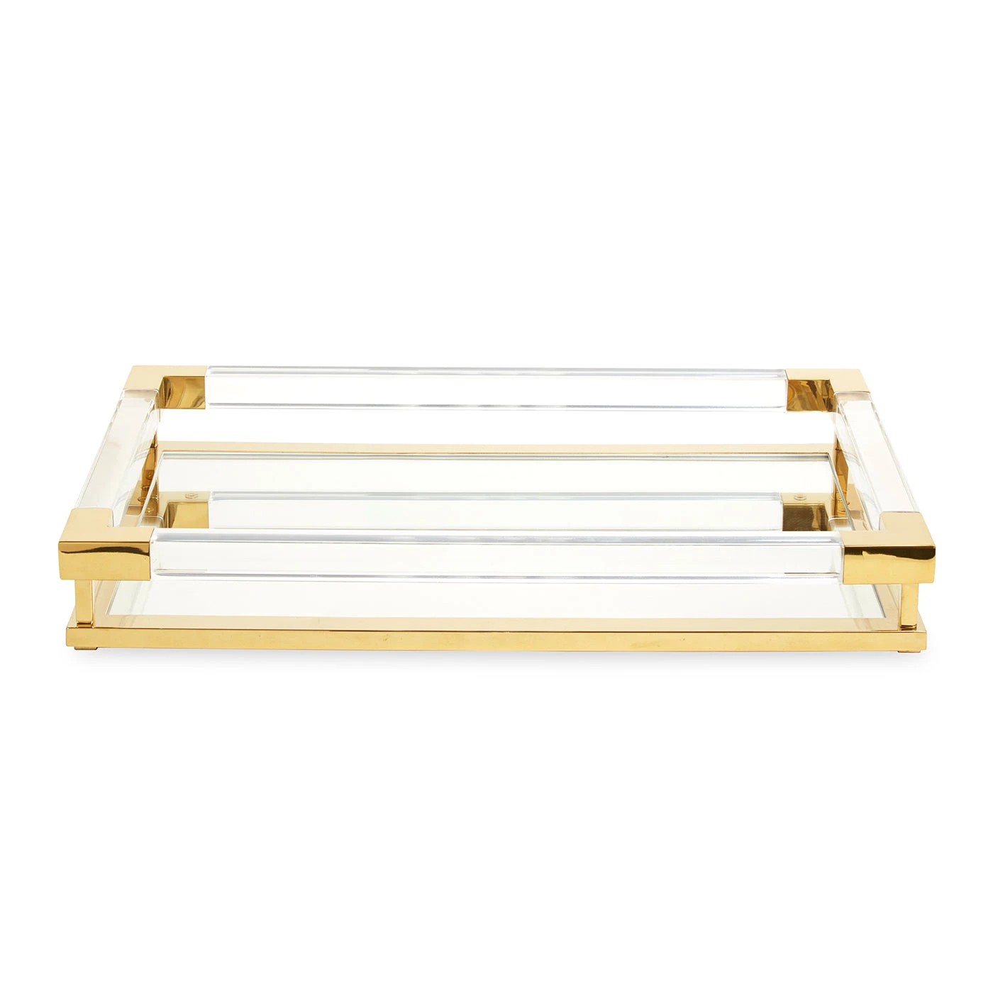Corral your prized possessions without crowding your space. In luxe acrylic with polished metal accents, our Jacques Tray is sized to befit a well-stocked bar, and is the perfect accessory for a generous ottoman or cocktail table. Available in luxe clear acrylic with polished brass accents or in smoke acrylic with polished nickel trimmings.
