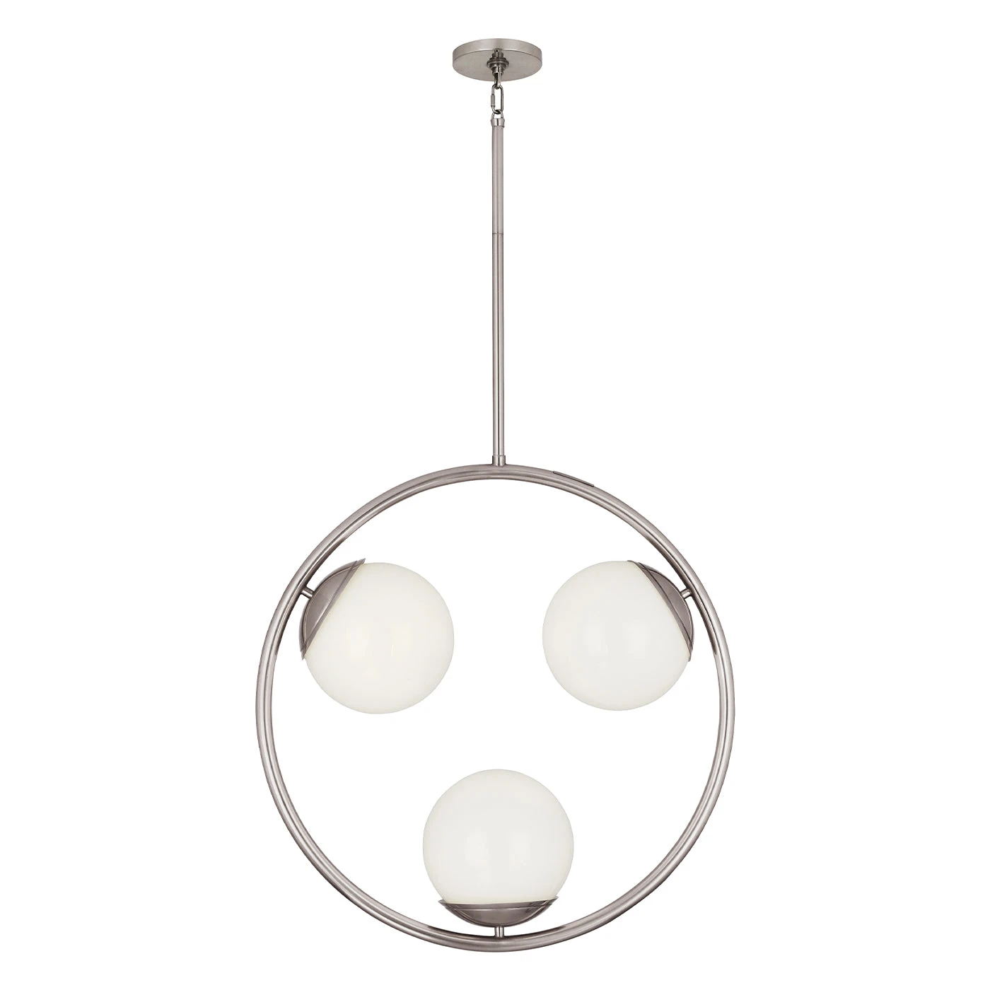 Our minimalist Jupiter Chandelier features three bulbs inside a modern brass or polished nickel circle. Its perfect proportions and large scale bring a bold glow to your dining room, or give a graphic greeting in your entryway.