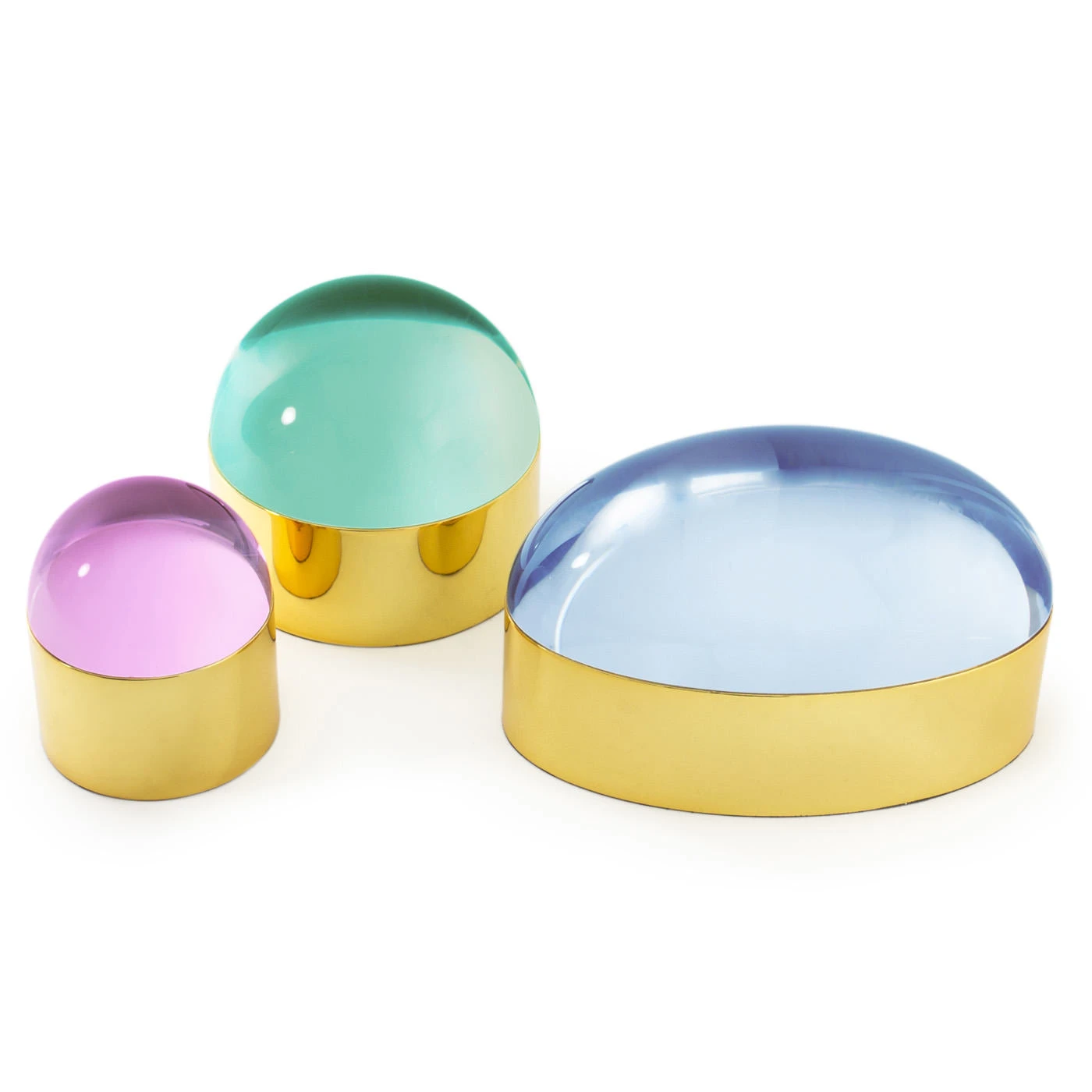 Float into our world of dreamy orbs and cabochons. Its polished brass base topped with a luminous clear or jewel toned acrylic lid, our Globo Box imparts high-voltage glamour on any tabletop, powder room counter, or cocktail table. Glowing gems on their own and even more intriguing when styled together. Available in three sizes.