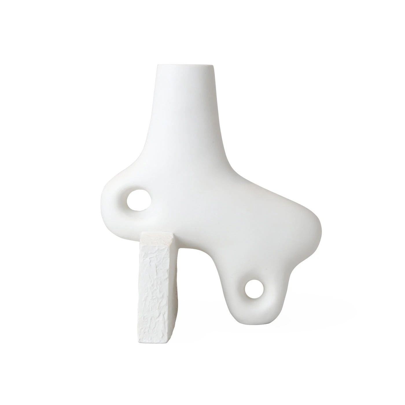Functional sculptures featuring smooth organic forms intersecting with rough-textured blocks of porcelain. The perfect place for colorful buds to pop, they also make a strong statement without.