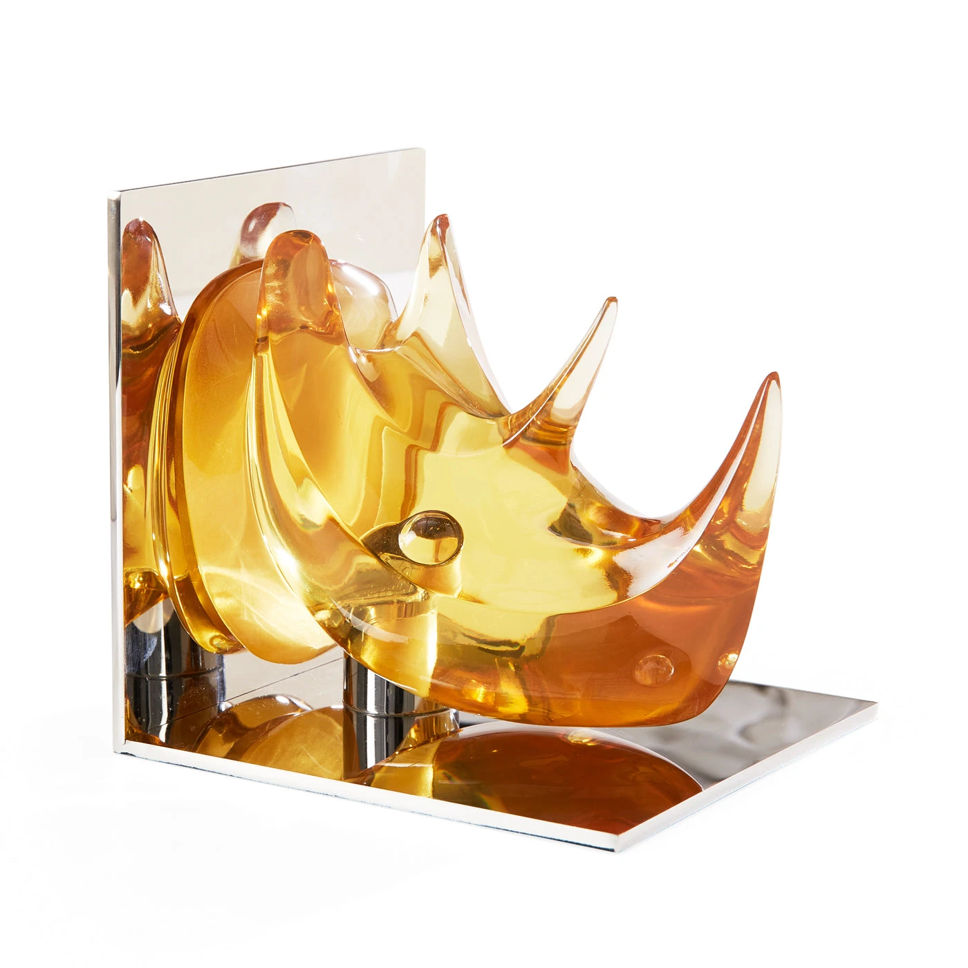 Take charge of your toppling tomes with our Rhino Bookends. Each features an L-shaped polished nickel base supporting a posh acrylic two-horned pachyderm. Wild with a warm amber glow, they’re a luminous prize to pair with your literature.