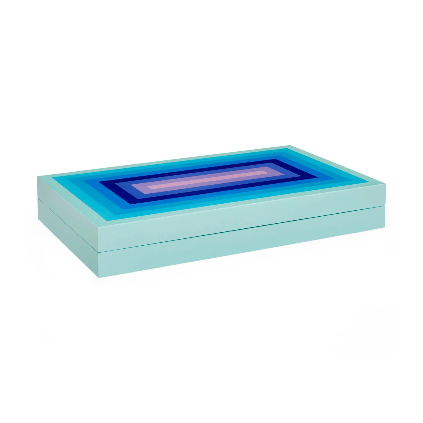 Crafted in couture lacquer and featuring 60s inspired concentric squares in cool blues and shades of lavender, our Scala Backgammon Set is the mod moment your game night needs. After vanquishing your foes, fold it closed for a cool cocktail table accent.