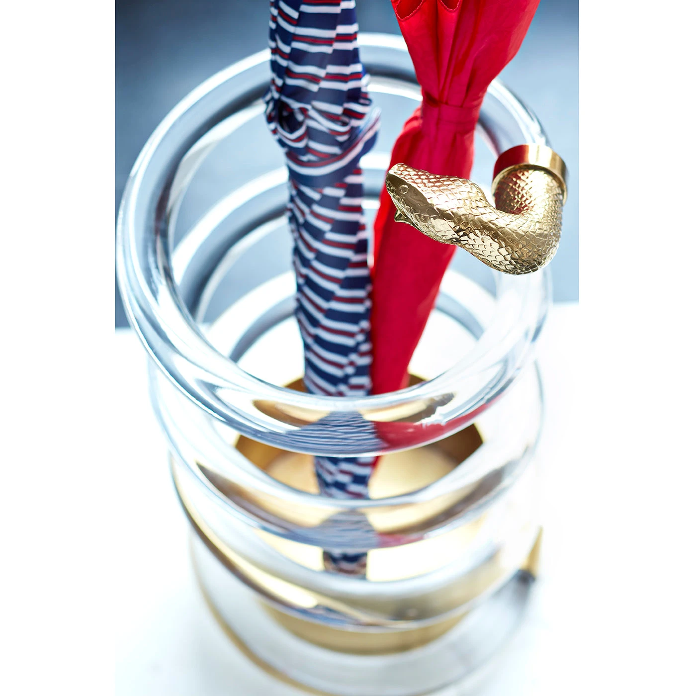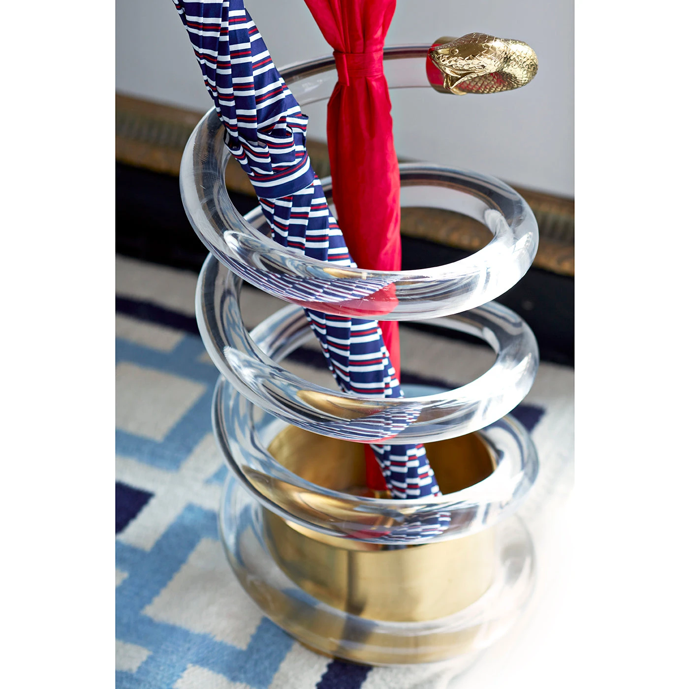 Twinkly acrylic coils weightlessly from a solid brass base and is capped with a brass serpent head ready to strike. Edgy glamour meets serpentine undulation for the ultimate in umbrella sophistication.