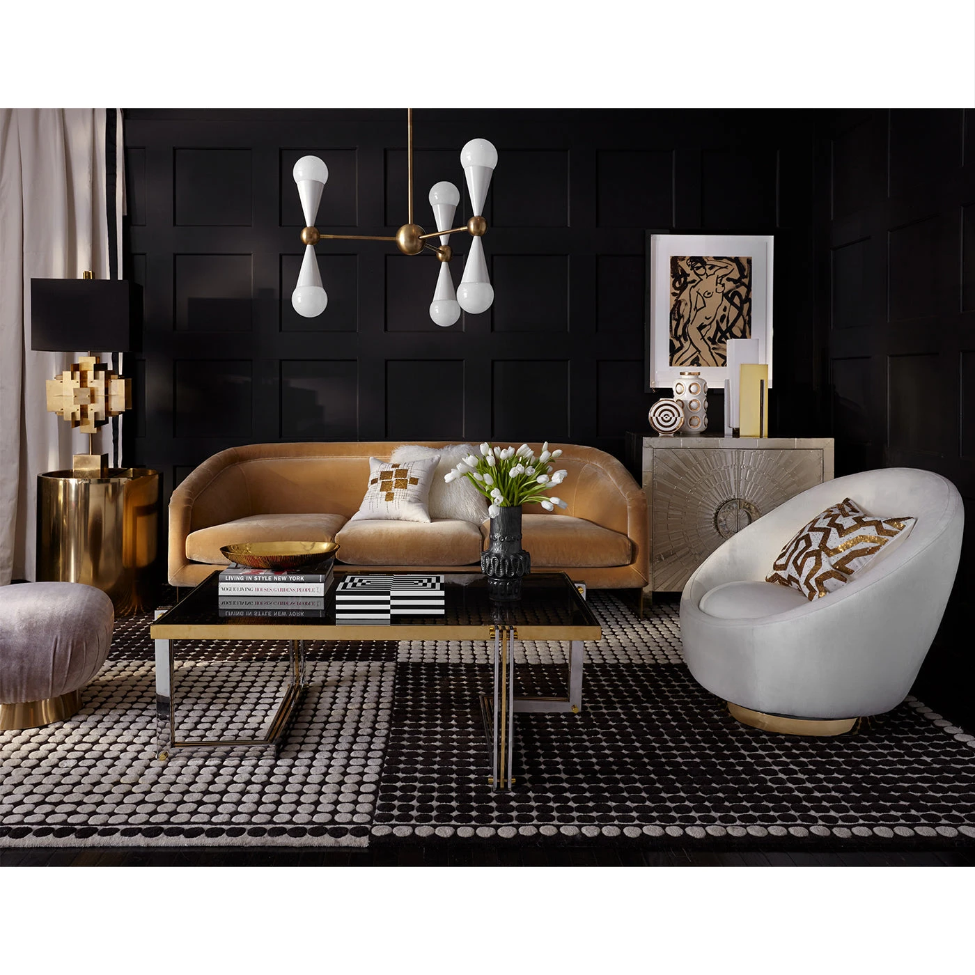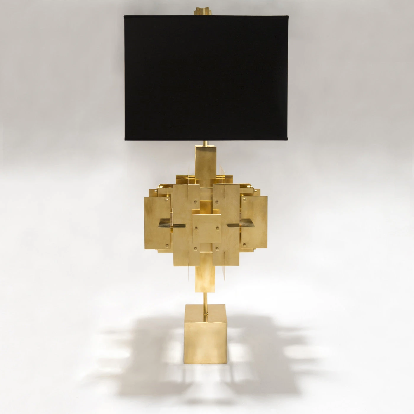 Inspired by a house of cards, our Puzzle Table Lamp is made of sheets of solid brass layered in a dynamic composition and is topped with a moody matte black shade. The architectural modernist feel is warmed up by the luminous metal. Greet your guests with a pair on your foyer console.