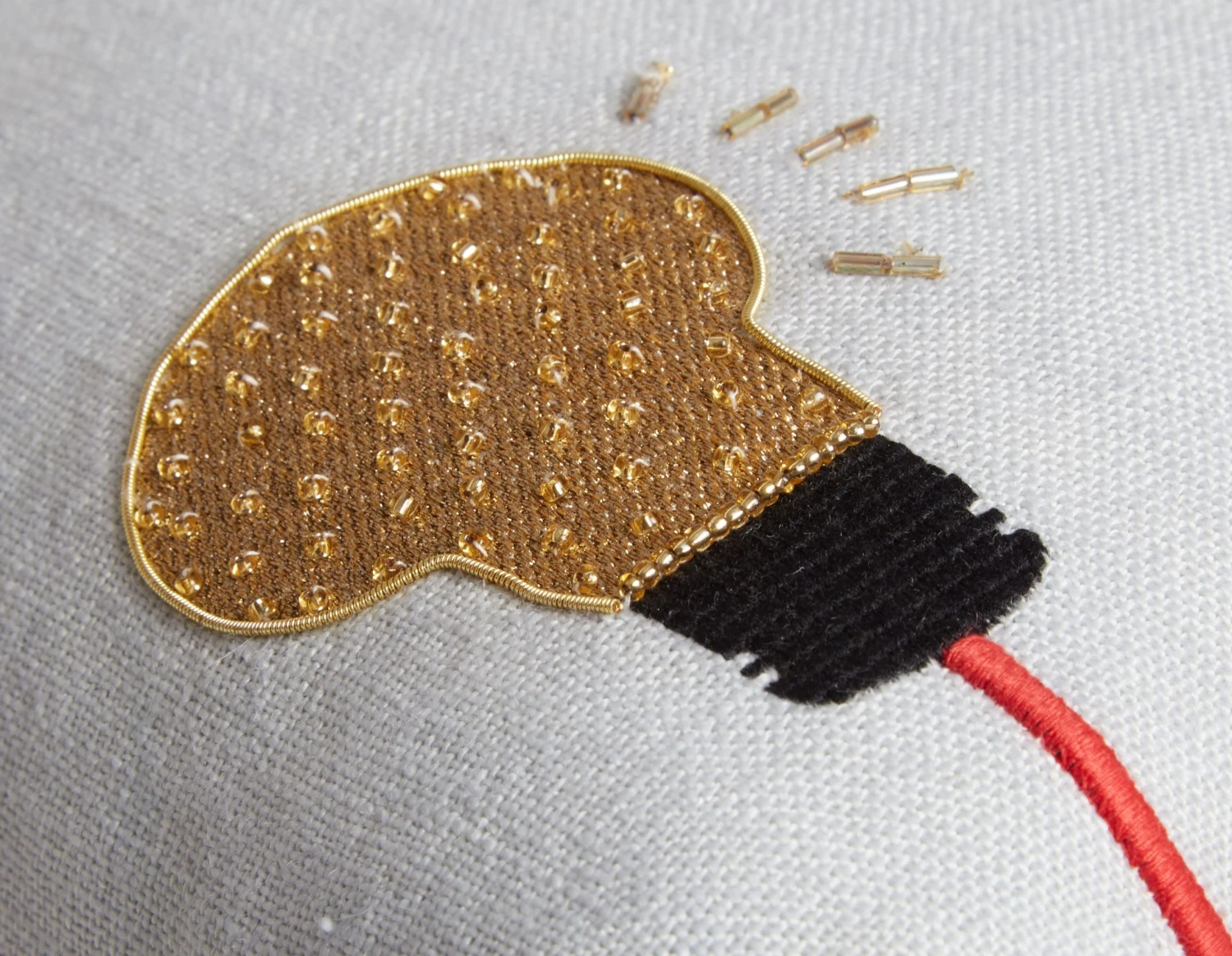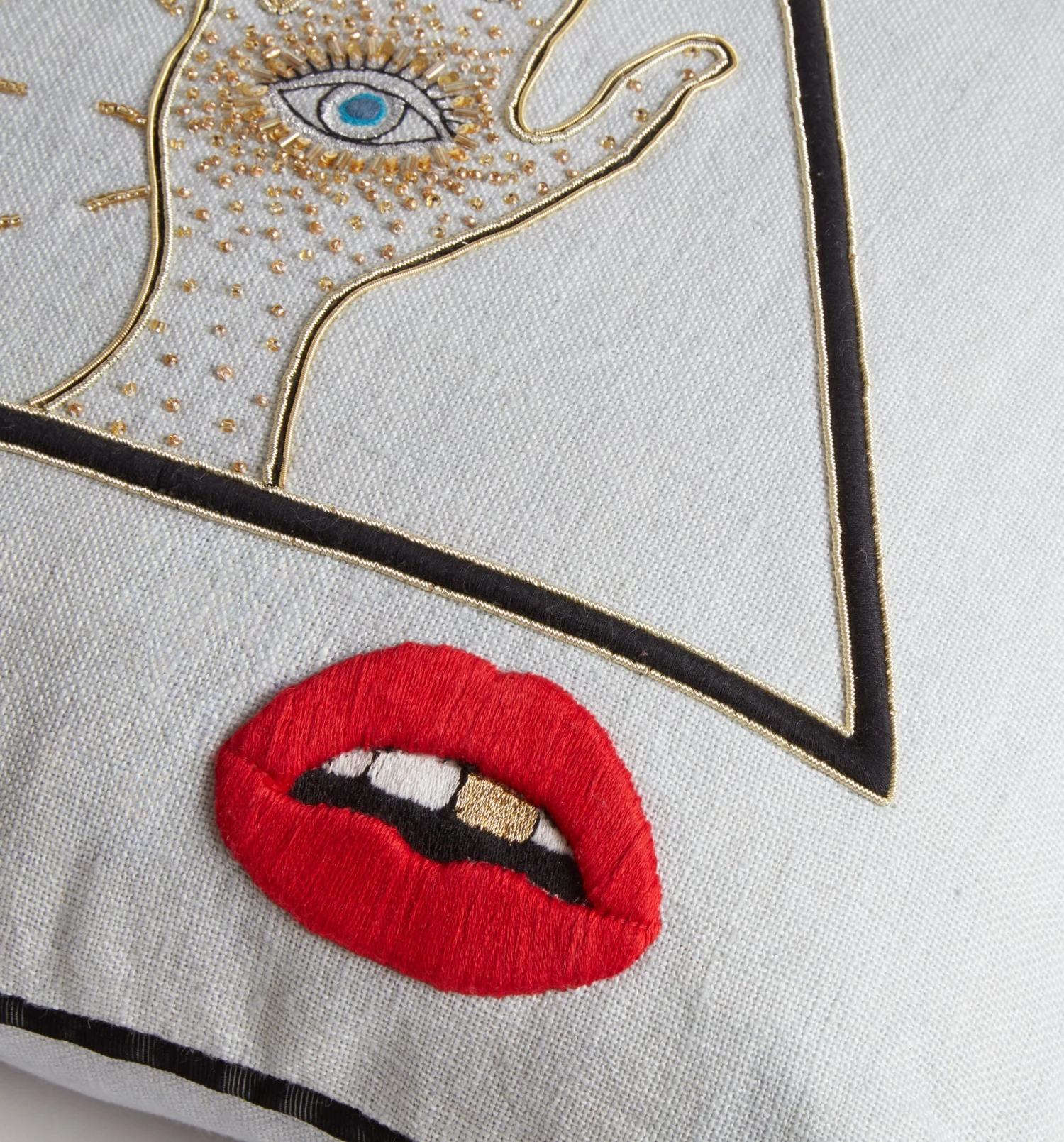 Evocative icons embroidered on light, sky blue linen. Hand beaded and adorned with sparkling gold threads, our Bijoux pillows are dreamy and provocative. Just the edgy glamour every eccentric pillowscape needs.